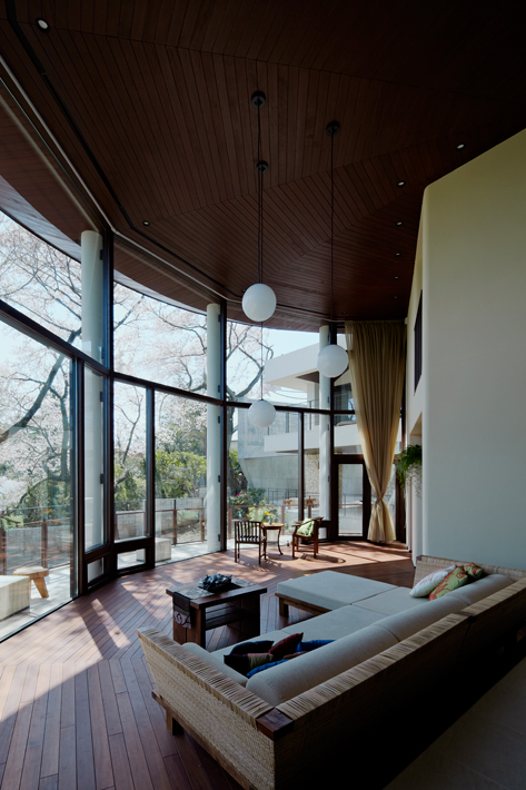 オリジナルに拘り、照明から家具にいたるまですべてデザインしバリで製作したり、伐ったケヤキを製材してカウンター材や手摺材の材料とし再利用するなどし、色々と拘ってデザインしたものがこの住宅を盛り上げてくれる存在にもなっています。床材もバリに視察に行き仕入れるまで行うなど、普段あまり味わえない様々な経験をする事が出来ました。こういった環境の中で細部に至る拘りを行える設計機会をもうけて頂いたクライアントに感謝しています。